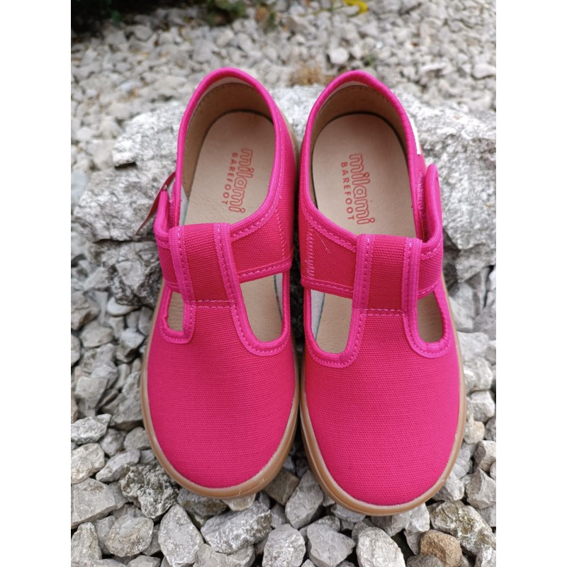 Papuče Milami vynikají svou lehkostí, ohebnou podrážkou, která voní a prostornou špičkou. Tato řada je barefoot. Svršek je textilní, podrážka přírodní guma ohebná ve všech směrech. Papuče mají zpevněný opatek a vyndávací pěnovou  vložku.